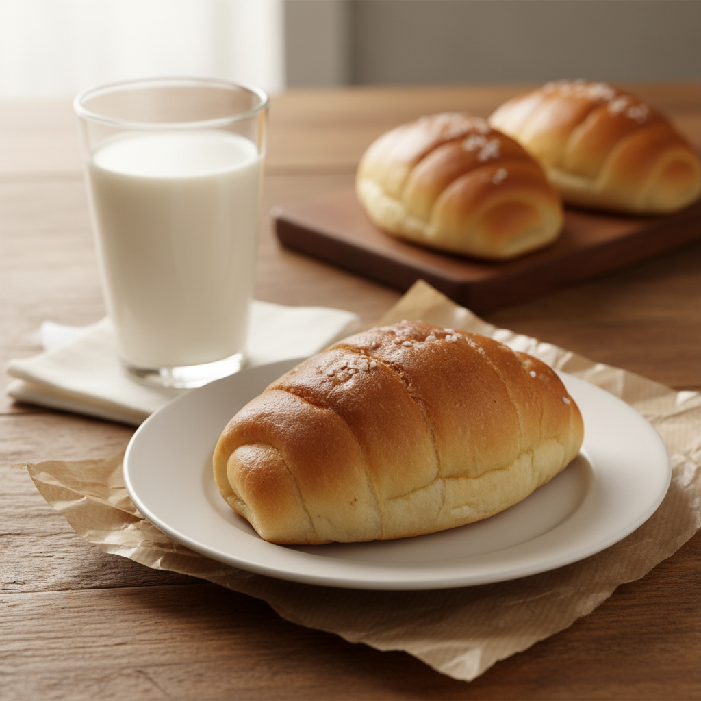 우드 식탁 위 흰색 원형 접시에 담긴 소금빵과 어울리는 우유와 함께 편안한 아침 식사 한끼를 연출..